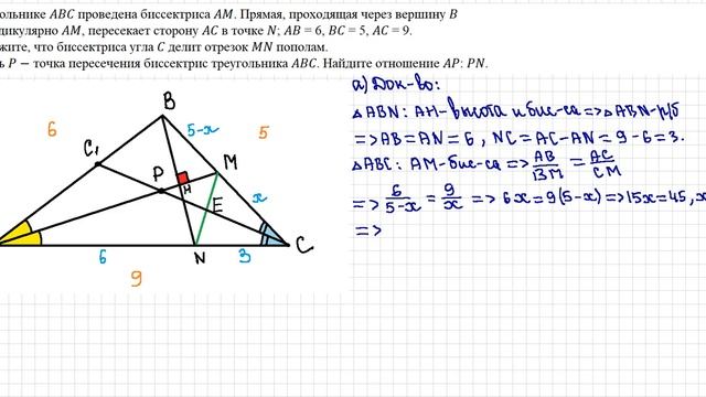 В треугольнике проведена биссектриса . Прямая, проходящая через вершину перпендикулярно , пересекает сторону в точке ; = 6, = 5, = 9. а) Докажите, что биссектриса угла делит отрезок пополам. б) Пусть − точка пересечения биссектрис треугольника . Найдите отношение : .