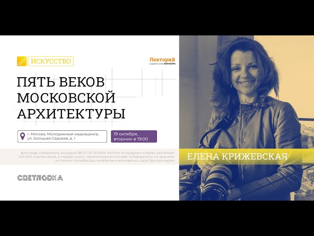 В Сандуновских банях есть готический зал потрясающей красоты. Мельников сделал собственный дом круглым, и тем самым сэкономил — ведь при равной площади периметр круга меньше периметра квадрата. При проектировании школы управления «Сколково» архитектор Дэвид Аджайе вдохновлялся творчеством Малевича. На лекции «Пять веков Московской архитектуры» узнаем, как строили самые необыкновенные здания Москвы — и в подробности рассмотрим их интерьеры на эффектных фотографиях Елены Крижевской. Елена Крижевская — фотограф, победитель конкурса BEST OF RUSSIA. Её блог в Instagram собрал уже более 140 000 подписчиков. Автор книг «Москва изнутри: роскошные интерьеры и архитектурные истории», «Архитектурная Москва. Путеводитель по зданиям и стилям». Москве по силам удивить даже искушенных туристов. Здесь можно найти здания, выполненные в самых разных архитектурных стилях, от старинных палат и соборов до стеклянных параллелепипедов современной архитектуры. Познакомиться с ними — значит проникнуть в самую душу древнего города. Во время лекции Елены Крижевской выясним: ? Где находится единственный в Москве храм папы римского? ? Сколько каменных зданий не храмовой архитектуры 15 века сохранилось до наших дней? ? Для строительства какого дворца доставлялись любые и даже дефицитные материалы, а само строительство было непубличным? ? Как попасть на экскурсию в здания, закрытые для общего доступа?