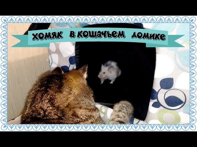 хомяк сбежал в кошачий домик, кошка недовольна этим.......................