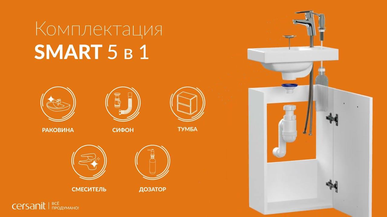 Компактный набор Smart состоит из тех же компонентов, что и Base + встраиваемый дозатор для жидкого мыла. Комплект станет универсальным дополнением интерьера ванной комнаты в любом стиле. В раковине предусмотрены сразу два отверстия — под смеситель и под носик дозатора, оснащённого вместительным флаконом. Скрытый тип размещения дозатора позволяет сохранить интерьер ванной комнаты максимально разгруженным. Преимущество такого дозатора – занимает минимум места, не переворачивается, упрощают уборку (остатки мыла с носика стекают в раковину), эстетично выглядит, помогает экономично расходовать жидкое мыло. Продуманное до мелочей предложение теперь доступно и для ванных комнат по разумной цене. Ссылка на товар - https://cersanit.ru/catalog/3d-be/mebel-dlya-vannoy/komplekty/vse-v-odnom-smart/.