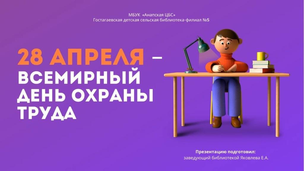Ежегодно, 28 апреля отмечается Всемирный День охраны труда, в его рамках Гостагаевской детской сельской библиотекой-филиалом № 5 был подготовлен видеоролик для детей об основных понятиях этого Дня. История Всемирного дня охраны труда начинается с 1989 года, когда профсоюзами и работниками был проведён «День памяти погибших работников» в США и Канаде в память о тех, кто пострадал или погиб на рабочем месте.Под нынешним названием ВДОТ впервые отмечался в 2003 году по инициативе Международной организация труда. МОТ, официально учредив этот день, преследовала цель привлечь внимание к масштабам проблемы. По данным МОТ, на рабочем месте ежедневно в мире погибает 5—6 тысяч человек, причём ежегодно эта цифра увеличивается приблизительно на 10 %. Нередки случаи, когда эти жертвы связаны с желанием работодателя сэкономить расходы по производству за счёт частичного или полного игнорирования сводов и правил техники безопасности. Всемирный День охраны труда призывает всех: работодателей, работников, общественность обратить внимание на безопасные условия труда на рабочих местах. Детям также как и взрослым, необходимо знать,что безопасность жизни-это самое главное. Заведующий Гостагаевской детской сельской библиотекой-филиалом № 5 МБУК "Анапская ЦБС" Яковлева Е.А