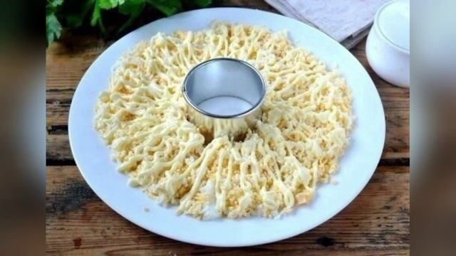 Ингредиенты: - Куриная грудка — 300 Грамм 🍗 - Сыр твердый — 150 Грамм🧀 - Яйца куриные — 4 Штуки🥚 - Морковь — 1 Штука🥕 - Киви — 1 Штука🥝 - Кукуруза консервированная — 100 Грамм🌽 - Сметана — 3 Ст. ложки 🥛 Способ приготовления: 1. Подготовьте все необходимые ингредиенты. Морковь и куриную грудку отварите до готовности, яйца сварите вкрутую (7-9 минут), это можно сделать заранее; 2. Твердый сыр и морковь натрите на мелкой терке; 3. На такой же терке натрите и яйца; 4. Куриную грудку порежьте кубиком или разделите на волокна, как вам больше нравится; 5. Начинайте выкладывать салат. Возьмите плоскую тарелку, в середину поставьте сервировочное кольцо. Вокруг кольца выложите яйца и смажьте сметаной; 6. Сверху выложите измельченную куриную грудку и также смажьте сметаной; 7. Следующий слой – морковь; 8. Далее – тертый твердый сыр, который обильно смажьте сметаной; 9. Сверху украсьте салат тонкими пластинами киви и кукурузой, как на фото; 10. Получится очень нарядно и празднично. Кушайте с удовольствием! Если есть возможность можете поддержать ДОНАТОМ ➕ СОХРАНИ рецепт, и поделись с ДРУЗЬЯМИ