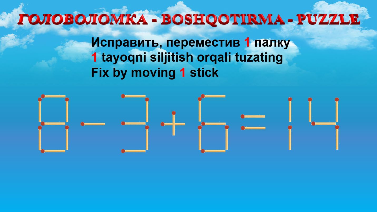 ГОЛОВОЛОМКА - BOSHQOTIRMA – PUZZLE. Спичка. 8-3+6=14, 9-8+8=10, 1+6+2=11, 4+3-2=8