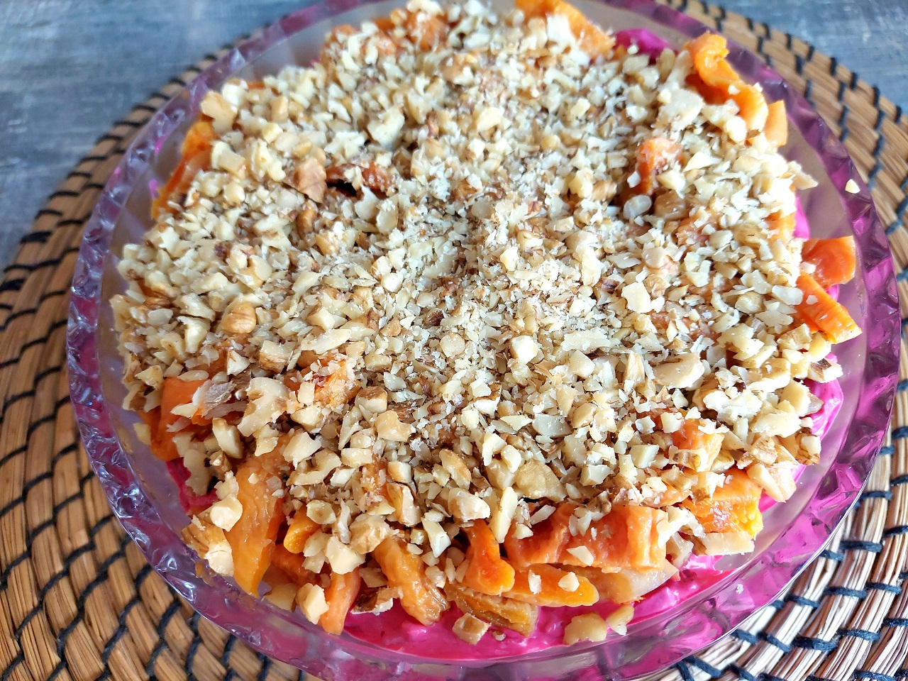 Свекольный салат с курагой и грецкими орехами с сырной заправкой.