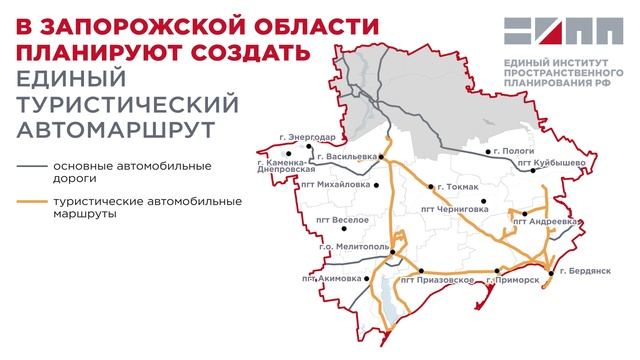Единый институт пространственного планирования РФ разработал Комплексную территориальную схему развития туризма Запорожской области. В рамках данной работы предлагается создать единый автомобильный маршрут, который улучшит придорожную инфраструктуру и сделает путешествия по региону более комфортными. Для формирования качественного туристического предложения и обеспечения комфорта туристов, путешествующих на личном транспорте, предполагается создание объектов сопутствующей инфраструктуры, развитие придорожного сервиса, организация многофункциональных зон, а также размещение кемпингов вблизи основных объектов притяжения туристов и вдоль новых проектируемых дорог. Завершить реализацию проекта планируется к 2030 году. Запорожская область обладает значительным потенциалом для развития автотуризма благодаря уникальным природным достопримечательностям и развитой дорожной сети. Автомобильный маршрут протяженностью более 350 км свяжет ключевые туристические центры области: г.о. Мелитополь, пгт Приазовское, г. Приморск, г. Бердянск, с. Андреевка, п. Черниговка, г. Токмак и г. Васильевка. Данный маршрут охватит разнообразные туристические объекты: - Природно-экологического туризма: национальный парк «Приазовский», косы Степановская и Пересыпь, озеро Среднее и озеро Долгое, Обиточная коса. - Пляжного туризма: Побережье Азовского моря в г. Бердянске и пгт Кирилловка. - Культурно-познавательного туризма: Храм Святителя Николая Мирликийского Чудотворца и художественный музей им. И.И. Бродского в Бердянске, историко-археологический музей-заповедник «Каменные могилы» в Мелитопольском городском округе, Васильевский историко-архитектурный музей-заповедник «Усадьба Попова», Токмакский краеведческий музей.