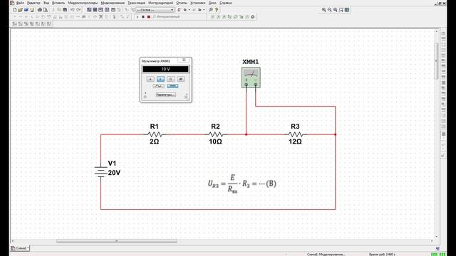 Сегодня мы будем исследовать входные напряжения помощью мультиметра XMM1. Соберем схему для измерения напряжения. Измерения напряжений с помощью мультиметра показали 10В на сопротивлении R3 при подключении схем к источнику постоянного напряжения равному 20В.