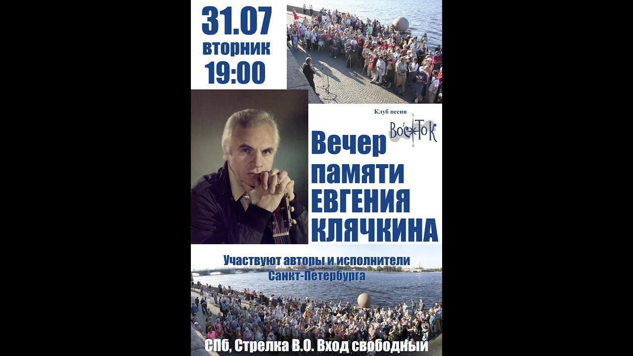 Вечер памяти Евгения Клячкина на Стрелке Васильевского острова. Санкт-Петербург. 31 июля 2018 г. Запись видео и монтаж - Алла Левитан. Запись и обработка звука - Дмитрий Зайцев. Дизайн афиши - Анастасия Евграфова. Фото - Валерий Гуменюк, Константин Петровский. Портрет Е. Клячкина из архива клуба песни "Восток". Ведущий – Леонид ЛЕВИН Елена ЛИСТОВА 0:03:38 Посвящение Альфреду Тальковскому («На острове лёг иней…») (Е. Листова) Сергей СИНЕЛЬНИКОВ 0:06:44 СКАЗКА («За синею-синею речкой…») (Муз. Е. Клячкина на стихи Нонны Слепаковой) 1961 Александр КОПОСОВ 0:10:00 ПИЛИГРИМЫ («Мимо ристалищ, капищ…») (Муз. Е. Клячкина на стихи Иосифа Бродского) 1961 Леонид ЛЕВИН 0:12:20 «Я подъезжаю к милому мне месту…» (Л. Левин) Дмитрий КОЛОМЕНСКИЙ 0:14:37 «Сидишь беременная, бледная…» (Муз. Е. Клячкина на стихи Андрея Вознесенского) 1962 Вячеслав КОВАЛЁВ 0:18:14 «Не гляди назад, не гляди…» (мелодия Михаила Зива, стихи Е. Клячкина) 1963 Сергей ИЛЬИН и Андрей БРОЖЕ (труба) 0:23:00 МЕЛОДИЯ В РИТМЕ ЛОДКИ («Ночью вода вертикальна, как лес…») (Е. Клячкин) 1966 Валерий ТОЛОЧКО 0:28:28 МОКРЫЙ ВАЛЬС («Как непрочны двери…») (Е. Клячкин) 1972 Виктор СОКОЛОВ 0:31:06 ОСЕННИЙ РОМАНС («Отчего в глазах прозрачно-карих...») (Е. Клячкин) 1973 Валентин ВИХОРЕВ 0:36:34 ЕВГЕНИЮ КЛЯЧКИНУ («Где же ты, мой сотоварищ…») (В. Вихорев) Лада ВИХОРЕВА и Герман КОЛОСОВ 0:39:26 ОЛЕНЕНОК («Ну что ты, олешек, ну маленький, что ты?..») (Е. Клячкин) 1975 Олег ДЕМИЧЕВ 0:42:13 ПОСВЯЩЕНИЕ ЕВГЕНИЮ КЛЯЧКИНУ («Мне банальностей груды не надо…») (О. Демичев) Николай ПРОСТАКОВ 0:46:11 ВАЛЬС ЛЕСТНИЦЫ («На лестнице хлопают двери...») (Е. Клячкин) 1977 Наталья ЛЕВИНА и Анна ДЕРЖАВИНА 0:48:58 В ПОЕЗДЕ («Когда качается в ночи вагон...») (Е. Клячкин) 1979 Олег ЛЕБЕДЕВ, Георгий ЗАУРБАЕВ и Игорь ЯКОВЛЕВ 0:53:16 ДВЕ ДЕВОЧКИ («Две девочки, две дочки, два сияния…») (Е. Клячкин) 1978 Лев ЮФИТ 0:57:11 ТРОЙКА («Тройка скачет, тройка мчится...») (Е. Клячкин) 1979 Вячеслав ВАХРАТИМОВ 1:01:13 РОМАНС. («День за днем, а год за годом катит...») (Е. Клячкин) 1986 Григорий ВОЙНЕР 1:06:51 ПОЕЗД ИЗДАЛЕКА («Дальний слышится гудок…») (Е. Клячкин) 1986 Леонид ЛЕВИН и Григорий ВОЙНЕР 1:13:35 «Сквозь границы и года…») (Л. Левин на мел. песни Е. Клячкина) Ирина ПИОТРОВСКАЯ 1:17:16 ГРАЧИ ПРИЛЕТЕЛИ («Стояли они у картины…») (Муз. Е. Клячкина на стихи Давида Самойлова) 1987 Татьяна КУТЕПОВА 1:19:44 «Смотрю, как складывалась жизнь...» (Е. Клячкин) 1993 Александр ТИМОФЕЕВ 1:26:19 ПОСЛАНИЕ ЕВГЕНИЯ КЛЯЧКИНА ЛЕОНИДУ ЛЕВИНУ С ТОГО СВЕТА («Я шлю тебе, мой друг, портрет…») (А. Тимофеев) 1:28:22 РЕКА («Была бы на свете такая река…») (А. Тимофеев) Все участники 1:33:42 МОИМ РОВЕСНИКАМ («Идёт бычок, качается…») (Е. Клячкин) 1:36:15 После концерта
