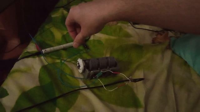 Принимает одну-две станции на КВ (радио Китая), катушка на феррите 70 витков, КПЕ 1 секция, антенна проволочная под подоконником, заземление к трубе отопления, диод Д18, конденсатор 4700 пф, звук через комбоусилитель.
