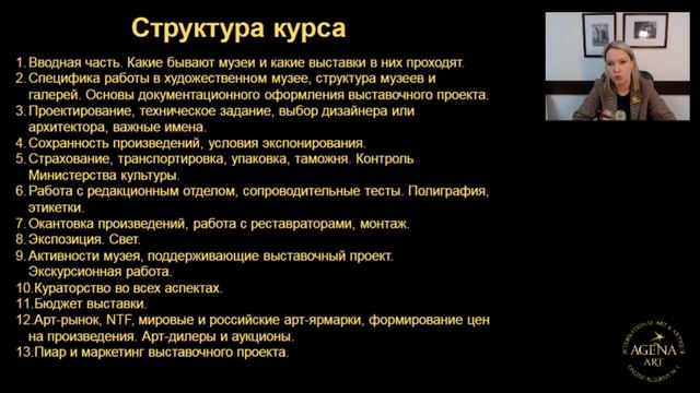 Ссылка на курс: https://agena-art.ru/art-biznes/organizatsiya-vystavki/ Ирина Макарова, кандидат культурологии, ведущий специалист отдела организации выставок Государственного музея изобразительных искусств им. А.С. Пушкина поделится с Вами всеми нюансами создания качественного выставочного пространства и проведения сопутствующих мероприятий. Вы узнаете и о креплениях для произведения искусства, и о рекламных мероприятиях, об организации правильного освещения и о взаимодействии с Министерством культуры РФ. Ну а все бесплатные лекции Академии Агена Арт здесь: https://agena-art.ru/kak-prohodit-obuchenie-v-akademii-besplatno/ Присоединяйтесь! С уважением, Ваш проводник в мир искусства и антиквариата Академия Агена Арт
