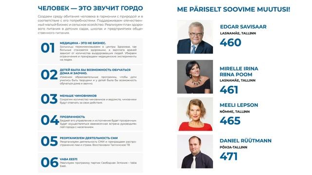 Из предвыборного интервью для Радио 4 (ERR русское радио) от изб.союза Ваба Ээсти - Vaba Eesti (НКО Родители Эстонии) Что предлагает изб.союз Ваба Ээсти (https://vabaeestierakond.ee/ru/) при избрании их представителей в горсовет г. Таллина? Мы предлагаем то, что никогда нигде не предлагалось и не реализовывалось. Главная наша задача - это создание тесной связи между избранниками-депутатами и жителями данного района/города для того, чтобы решать все вопросы, связанные с данным районом или целым городом, будь-то стройка, парковка, озеленение. Так как по конституции народ — носитель власти в государстве, то решение квартирных товариществ, собственников, результаты опросов жителей, где интересы большинства являются решающими, должны быть в приоритете для депутатов и через них - для чиновников. Чиновники отчитываются перед депутатами и несут ответственность за свою деятельность перед горсоветом и жителями района/города. Почему именно представители изб.союза Ваба Ээсти должны быть выбраны в горсовет? Чем отличаются наши кандидаты от других? У нас нет страха и мы сильны духом, мы те, кто стояли на Тоомпеа 5 месяцев, выступая за права и свободы человека в противостоянии с властями, принимавшими антиконституционные законы. Мы те, кто не только говорит, но и делает и отвечает за сделанное. Наш девиз «Главное — человек», мы защищаем традиционную семью и ее ценности. Какая главная политическая цель союза Ваба Ээсти? Самая главная цель Ваба Ээсти - организация общенародного референдума и принятие решения о членстве в Европейском союзе, принятие поправки к конституции Эстонии, предоставляющей народу исполнительную власть, отказ от многопартийной системы и передача народу управление государством по принципу "снизу вверх". Что еще важно воплотить в жизнь союзу Ваба Ээсти? Мы против медицинских экспериментов, особенно на детях. Мы хотим покончить с ковидными ограничениями и всеми формами принуждения, дискриминации и запугивания. Люди имеют право быть свободными в принятии решений о своем собственном здоровье, лечении и работе. Ниже представлено наше интервью Радио 4, данное Надеждой Андреевой (Малышевой), кандидатом от Мустамяэ №464. Главный кандидат от Избирательного союза Vaba Eesti- Эдгар Сависаар, №460, Ласнамяэ. https://r4.err.ee/1608363888/nadezhda-andreeva-iz-svobodnoj-jestonii-deputaty-gorsobranija-dolzhny-bolshe-slushat-prostyh-zhitelej https://vabaeestierakond.ee/ru/ https://vabaeesti.ee
