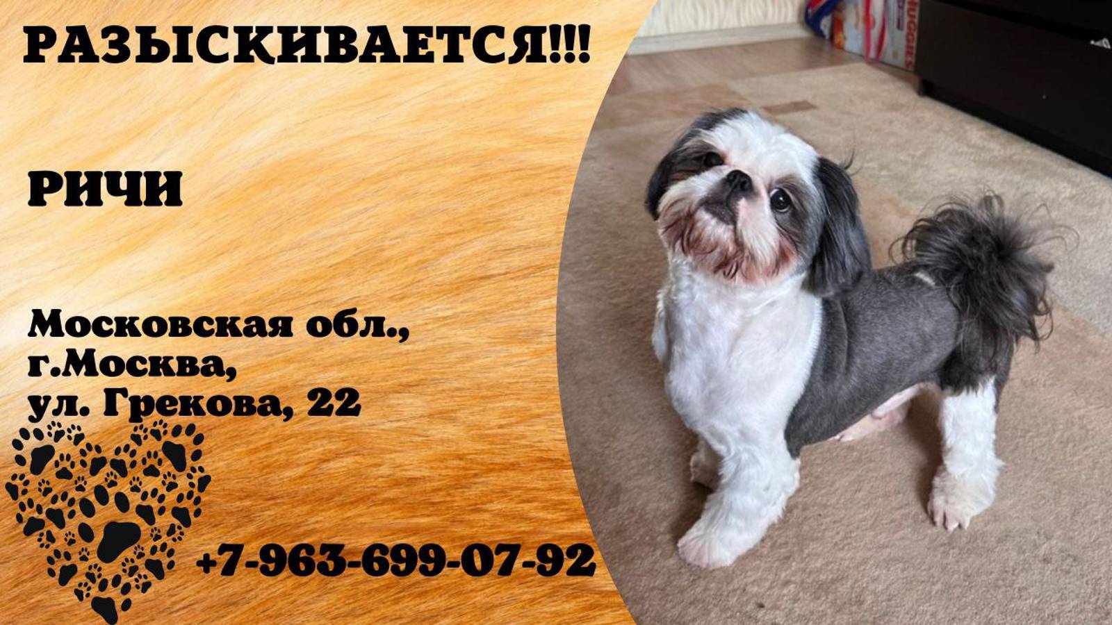Московская Москва Пропала собака Сегодня ночью 01.10.2024 вывернулся из ошейника и убежал. Кобель. Зовут Ричи. Очень пугливый. Боится людей и животных. На руки не идет. Убежал в Москва, ул. Грекова, 22. Кто имеет хоть какую-то информацию, прошу связаться по телефону: Имя хозяина: Хозяйка Телефон: +7 963 699-07-92 Адрес: улица Грекова, 22, Москва Инфо: https://vk.com/wall-198815410_155076