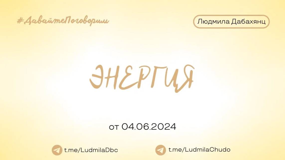 Запись эфира от 04.06.2024 Рубрика #ДавайтеПоговорим ❤️ ЭНЕРГИЯ ? что это? ? о чём это вообще? ? где её взять? ? что с ней делать? Провела беседу: #просто_волшебница психотерапевт, целитель ЛЮДМИЛА ДАБАХЯНЦ /Куратор АРТИВИС Киров Канал https://t.me/LudmilaChudo ВЫ МОЖЕТЕ СТАТЬ УЧАСТНИКОМ ЭФИРА И ЗАДАТЬ СВОИ ВОПРОСЫ. https://t.me/ludmiladbc Дабахянц Людмила ‼️ жду ваши вопросы на следующую встречу ‼️ игра "Кто я?" Пишите лс - https://t.me/ludmiladbc , если хотите участвовать ✓ Обязательно поставь 💗 ✓ Задавайте вопросы в комментариях ✓ Подпишись на канал ✓ И поделись с близкими Это будет вашим балансом за движение и получение энергии. Если есть желание создать баланс брать-давать... приму от всего сердца с благословением (донейшн)= С Огромной Любовью, Дабахянц Людмила 💓 ✨ Telegram: https://t.me/ludmiladbc ✨ Канал в telegram “Я ЕСТЬ ТО, ЧТО Я ЕСТЬ”: https://t.me/LudmilaChudo ✨Онлайн-школа: https://ludmilachudo.skillspace.ru/school
