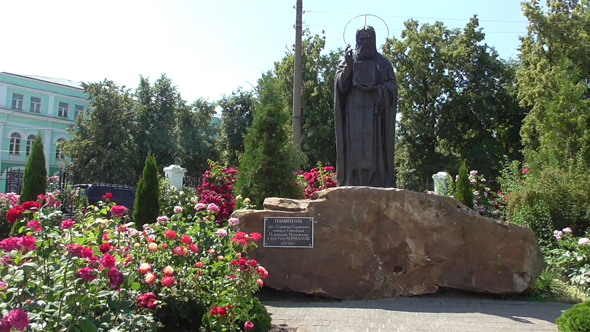 Цветы розы цветут. Памятник Серафима Саровского в городе Орле. Город Орёл.