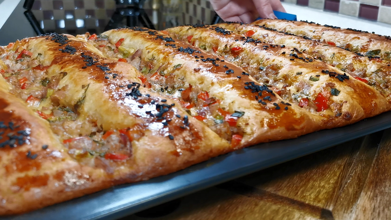 Очень пышное и нежное тесто без замеса руками. Этим способом получаются пироги пироги даже у самых неопытных. Просто смешайте всё ложкой и сразу на противень. Приготовьте пышный дрожжевой пирог. Все делается очень просто и быстро. Это просто чудесный рецепт. Очень советую попробовать. Я испекла дрожжевой пирог с мясом и овощами, но начинку можно делать любую, даже сладкую. Ингредиенты для пирога 35х25 см: Тесто Мука - 480 гр Яйца - 2 шт. (1 целое яйцо + 1 яичный белок) Молоко - 300 мл Растительное масло - 100 мл Сахар 2 ст.л. Соль 1 ч.л. Дрожжи - 7 гр (1 упаковка) Начинка Фарш - 250 гр Репчатый лук - 1 шт. Болгарский перец - 1/2 шт. Помидоры - 1 шт. Сыр - 70 гр Зелёный лук, укроп - по вкусу Соль, перец, зира - по вкусу Растительное масло для жарки Дополнительно Растительное масло для смазывания формы и рук Яичный желток для смазывания пирога Кунжут для украшения пирога ***************************************************************************** Одноклассники https://ok.ru/group/60739114565686 Яндекс Дзен https://zen.yandex.ru/rozovybaklazan Facebook https://www.facebook.com/groups/30739... Ютуб https://www.youtube.com/c/РозовыйБаклажан/featured ***************************************************************************** Музыкальная композиция: She No Dull Beat Автор: Nana Kwabena Ссылка на исполнителя: https://www.youtube.com/channel/UCR8WNU7NJOQYJMfQgBAUSqg Музыка, продвигаемая музыкальной библиотекой Happy Soul Music Library https://happysoulmusic.com https://happysoulmusic.com/audio/she_no_dull_beat_-_nana_kwabena-mp3/ #пироги #тесто #выпечка #трюкстестом #тестобеззамеса #рецептыпирогов #простойрецепт #пирогрецепт #тесторецепт #какприготовитьтестобеззамеса #каксделатьпышноетесто #пирогисначинкой #простыепироги #пирогсмясом #мяснойпирог