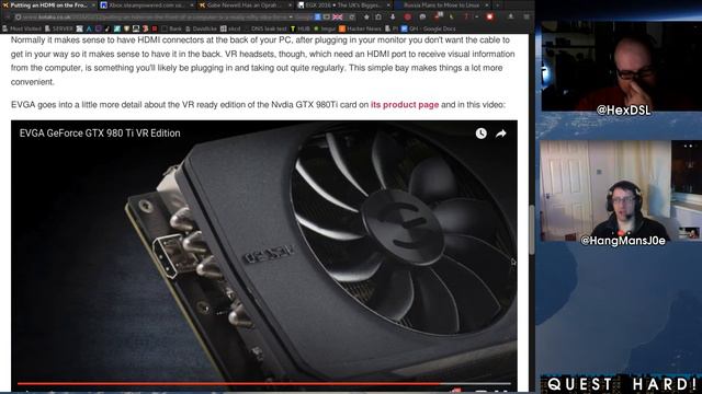 What we have been playing: Hex: [3DS]Terraria, [3DS]Shovel Knight, [Linux+Wine]WoW Fish: [Win] WoW, [Win] Witcher 3 Together: Hangman talked to Hex while he played WoW :| ITEMS: Amazon Game engine? https://aws.amazon.com/blogs/aws/lumberyard-amazon-gamelift-twitch-for-games-on-aws/ I dunno :| Nvidia talk about Vulkan https://developer.nvidia.com/transitioning-opengl-vulkan Its just like Star Trek First Contact :) Xbox.steampowered.com https://www.robtex.com/?dns=xbox.steampowered.com WHAT DOES THIS MEAN????? Gabe Gave everyone a Vive http://www.kotaku.co.uk/2016/02/11/gabe-newell-has-an-oprah-moment Can i have a Vive please? - but really, i can see why he would do this. HDMI on the front? http://www.kotaku.co.uk/2016/02/12/putting-an-hdmi-on-the-front-of-a-computer-is-a-really-nifty-idea-for-vr-headsets Good idea EGX 2016 https://www.egx.net/egx YEAH! Russia Moved to linux http://news.softpedia.com/news/russia-plans-to-move-to-linux-500278.shtml Cool! Thank you for watching. System Specs: OS: Manjaro Linux (all updates done before video recording) DE: GNOME 3.18 CPU: I5 3330 RAM: 16GB (Corsair, 1600) GFX: NVIDIA 750ti 2GB (NVIDIA Drivers) Get me on... Twitch: http://www.twitch.tv/hexdsl/ Twitter: www.twitter.com/HexDSL/ E-mail: HexDSL@Questhard.com G+: https://plus.google.com/+HexDSL And, yes I am interested in collaborations.