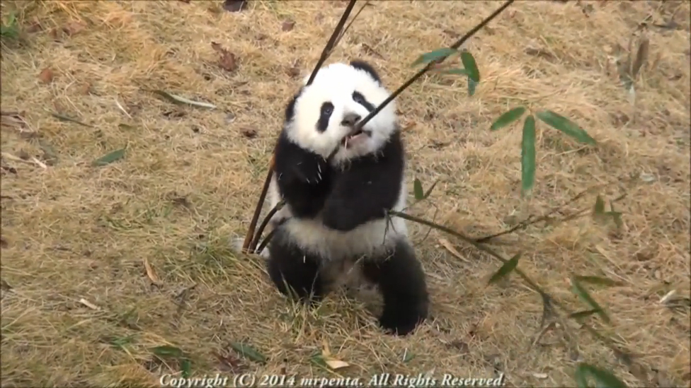 Маленькая панда играет с бамбуком