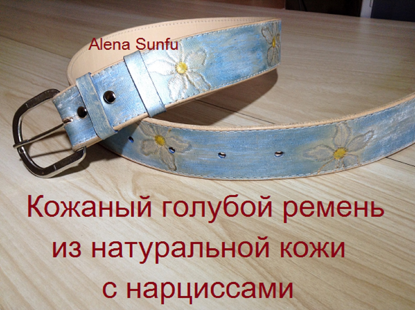 ПРОДАН. Ремень с голубыми нарциссами из кожи растительного дубления. Ручная работа