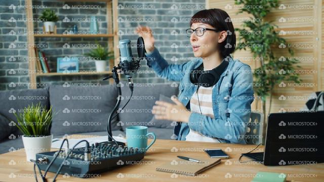 Emotional young woman is speaking gesturing recording audio in microphone at home using modern equipment. People, youth lifestyle and technology concept. You can download this footage(4K, 1080p) and watch our potfolio at: https://www.videoblocks.com/portfolio/silverkblack https://www.shutterstock.com/video/gallery/454918/ https://www.pond5.com/artist/silverkblack https://www.fotolia.com/p/200970382 Available for time-lapse and hyperlapse production worldwide. For direct licensing please contact us: silverkblack@gmail.com Silverkblack Stock - Royalty Free stock video and timelapse footages for your projects - mass media, advertising, web site, films, presentations, blog, design etc .