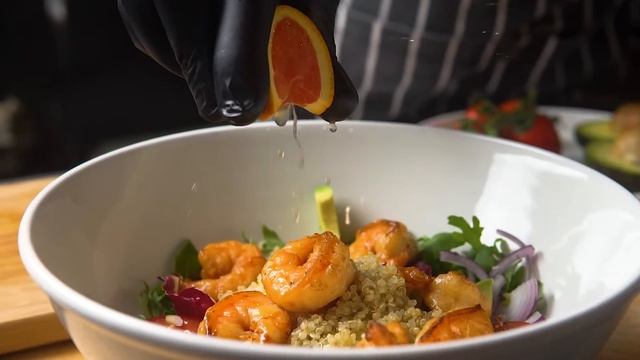 Что нам понадобится: * Креветки 120 гр * Авокадо 100 гр * Киноа 100 гр * Красный лук 30 гр * Черри 80 гр * Руккола 70 гр * Заправка 80 мл * Специи (соль/перец по вкусу) Приготовление: Киноа отвариваем согласно рекомендациям на упаковке. Главное - не переварить. Креветки маринуем и обжариваем на растительном масле. Лук нарезаем тонкими полукольцами. Черри разрезаем пополам. Авокадо нарезаем крупными кубиками. Рукколу промываем и кладем просушиться на полотенце. Для заправки берем сок красного апельсина, сок лимона и смешиваем их с соевым соусом и оливковым маслом. Соединяем все ингредиенты и заправляем нашим соусом.