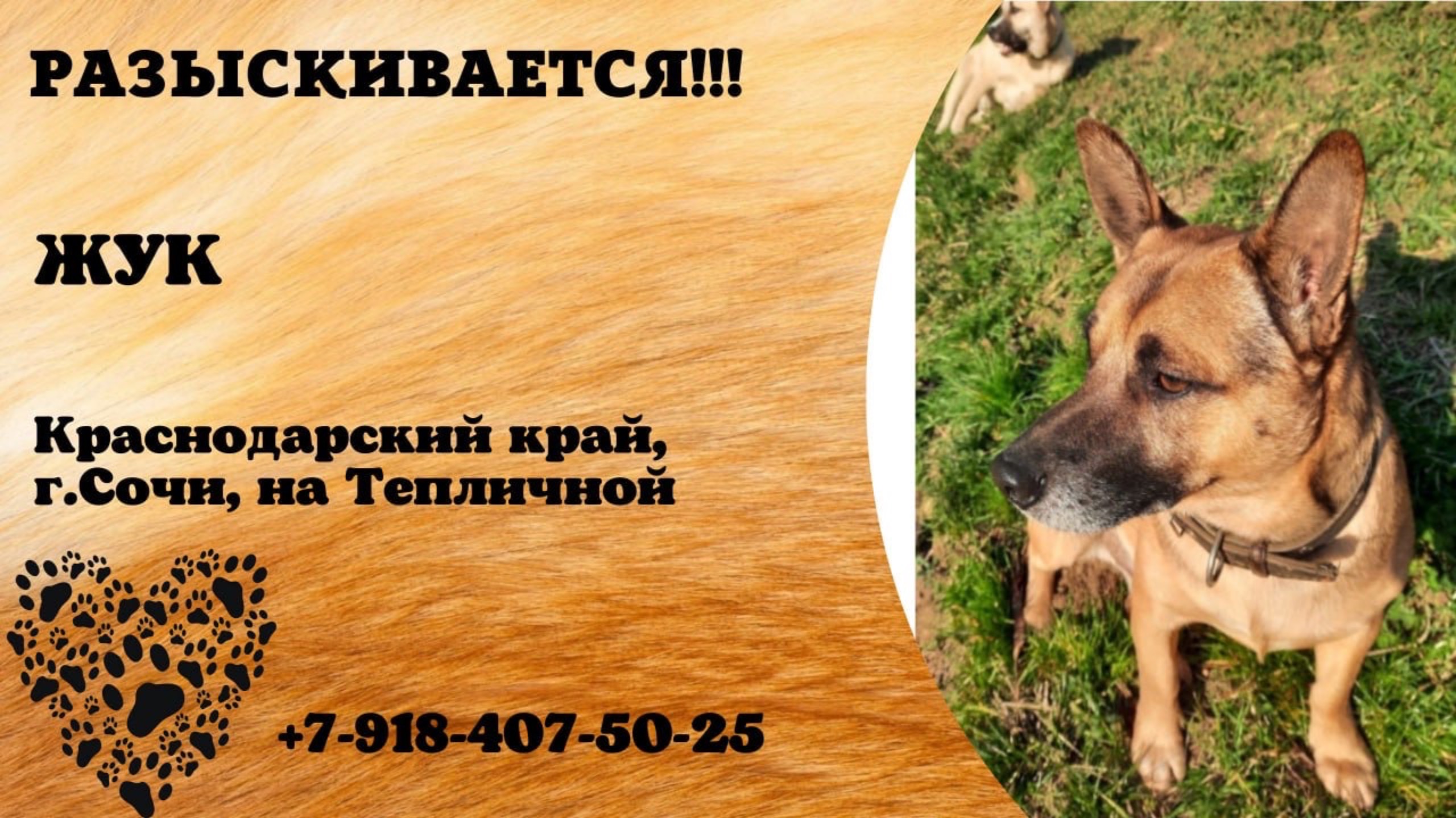 Краснодарский Сочи Пропала собака Сочи. Кличка «Жук» возраст 3-4 года, пропал 8 декабря 24г в 14.30 около дома За собаками мог побежать,и потеряться, с людьми идет на контакт С ошейником ( цепочка наполовину обмотана лентой), купированный хвост Рыже черный окрас Пропал пес на Тепличной Просьба сообщить по телефону 89184075025 Автор: https://vk.com/id397186026 Инфо https://vk.com/wall-198815410_166333 Автор Стас Анохин #пропала_собака#сочи