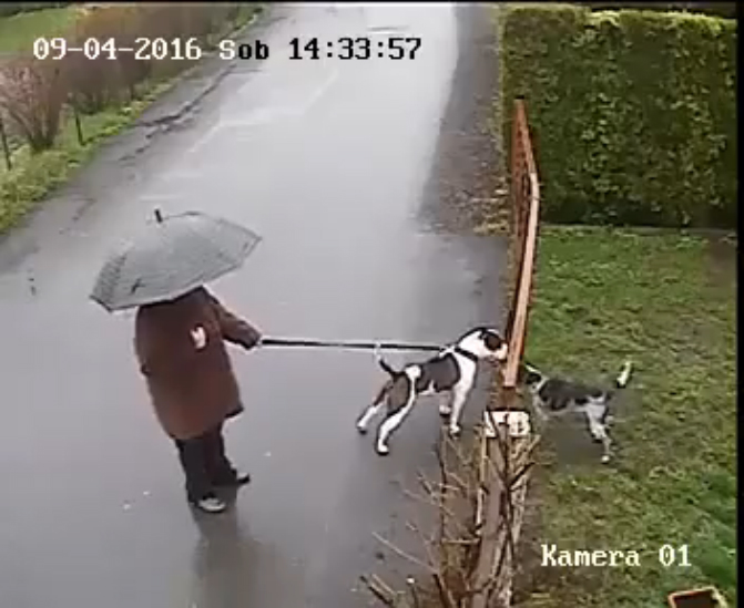 Кот вступился за своего друга пса и бросился на мимо проходящую собаку с хозяином. #кот #собака #прохожий #прикол #животные