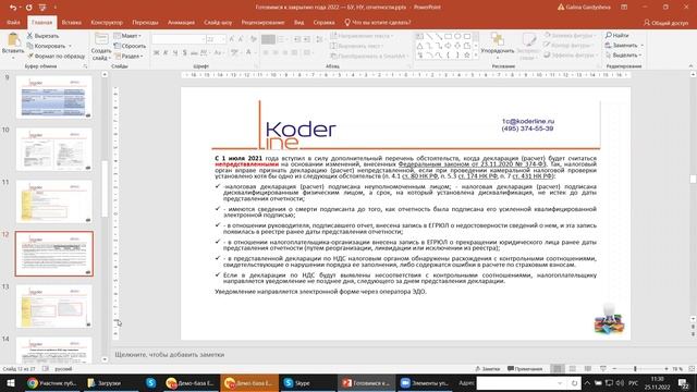 Компания «Кодерлайн» провела вебинар «ERP 2.5.9 - что нового (на примере 1С:ERP)» Ведущая: Гардышева Галина - консультант-аналитик 1С:ЕRP Целевая аудитория для бухгалтеров, пользователей и специалистов ИТ-подразделений компаний различных отраслей. Описание 2021 год для бухгалтеров стал тестом на стрессоустойчивость, столько нововведений он принес. Но и 2022 год не уступает ему по количеству изменений, которые затронули и бухгалтерскую и налоговую отчетность. Сегодня мы разберемся с новшествами и изменениями, коснувшимися БУ и НУ, которые требуется учесть при закрытии года и подготовке регламентированной отчетности. С помощью программы 1С:ERP проверим, что требуется сделать для корректного закрытия года, какие настройки проверить, какие отчеты подготовить. Программа 1. Изменения по НДС и отчетности по НДС; 2. Изменения по налогу на прибыль, новые льготы; 3. Изменения в международных соглашениях и банковских платежах в связи с санкциями; 4. Отчетность в военкоматы; 5. Основания для признания налоговой декларации непредставленной; 6. Отражение в регламентированном учете в 1С:ERP 2.5 7. Дополнительные сервисы, отчеты.