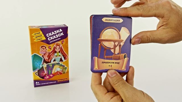 Добро пожаловать в мир сказок. Сказкотерапия начинается! Настольная игра для всей семьи СКАЗКА СКАЗОК от Bondibon позволяет придумать самые увлекательные, невероятные, захватывающие истории! В ходе игры дети и взрослые тренируют память, логическое мышление, фантазию и воображение, навык публичных выступлений и способность к импровизации. Игра способствует увеличению словарного запаса и расширению кругозора. В игре 4 типа карт. На картах с синей рубашкой изображены персонажи – русалочка, принцесса, рыцарь, пират, король и другие. На картах с красной рубашкой – предметы, с зеленой – локации. На карточках с фиолетовой рубашкой прописаны действия. Рассортируйте карты и разложите 4 колоды на столе. Дополнительно Вам понадобятся - весёлая компания, хорошее настроение и фантазия. Игроки берут по одной карте из колод СИНЕГО, КРАСНОГО и ЗЕЛЁНОГО цветов. Не переворачивая карточки, кладут их перед собой на стол лицевой стороной вниз. В свой ход игрок поочерёдно открывает по одной своей карточке и начинает сочинять увлекательную историю, опираясь на выпавшие карты. В нижней части каждой карточки прописано, что необходимо сделать, рассказывая историю. Например, взять 2 алмаза или добавить в игру карточку из колоды ФИОЛЕТОВОГО цвета. На лицевой стороне карточек из ФИОЛЕТОВОЙ колоды прописаны различные действия, которые необходимо выполнить игроку, рассказывая сказку. Самые лучшие рассказы — это сказки, придуманные в кругу веселой компании. Побудьте Шахерезадой и получите в награду алмазы и восхищение публики. В комплект игры входят инструкция, 44 карточки и 28 фишек с алмазами. Количество игроков 2-6. Возраст 4+. Развивающая серия Играй Думай УчисьДарите правильные подарки девочкам и мальчикам на день рождения, Новый год и любой другой праздник. Артикул игры: ВВ4881.
