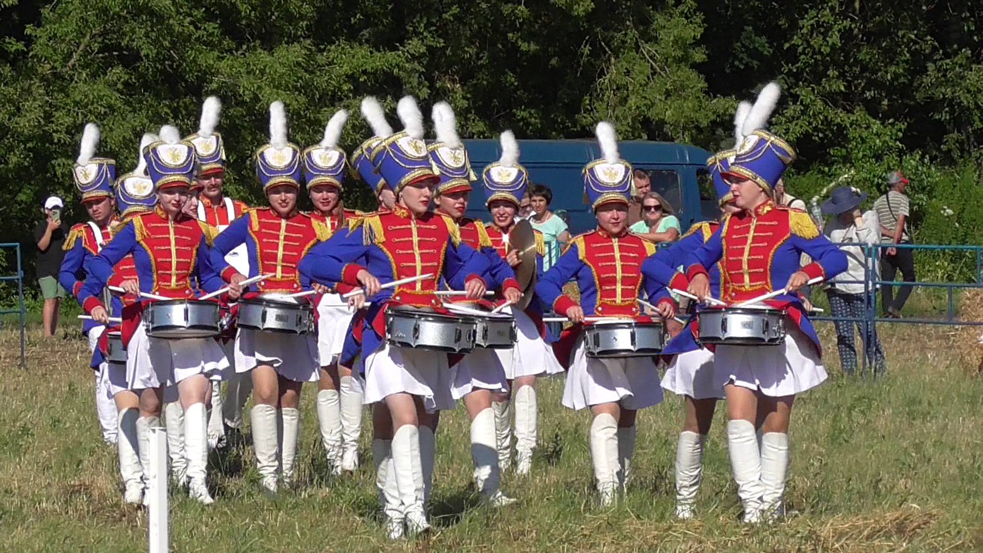 Барабанщицы барабанят на барабанах. Девушки на лошадях. «День русского поля», 06.07.2024 год.