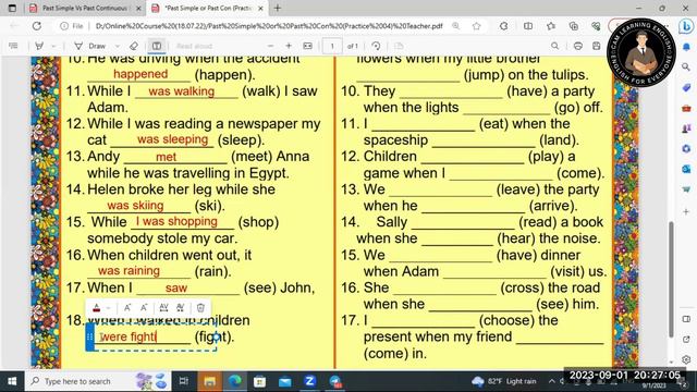 Title: Episode 07 Practice Exercises, Past Simple Vs Past Continuous Tense SUBSCRIBE FOR MORE: https://bit.ly/2KODyuX Hello! Everyone. Welcome to my channel "Cam Learning English". #camlearningenglish #DailyEnglish If you are interested in this video, please LIKE, SHARE to your friends or the students. Don't forget to SUBSCRIBE my channel to get the most uploaded videos. Thanks for watching. If you don't have enough time to learn English at school directly, you can learn via online with me. Please contact me as follow; - 092 34 93 93 (Telegram) - 066 781 782 (Telegram) Facebook: Sitha Poch Link: https://web.facebook.com/sitha.poch/ Good Luck!
