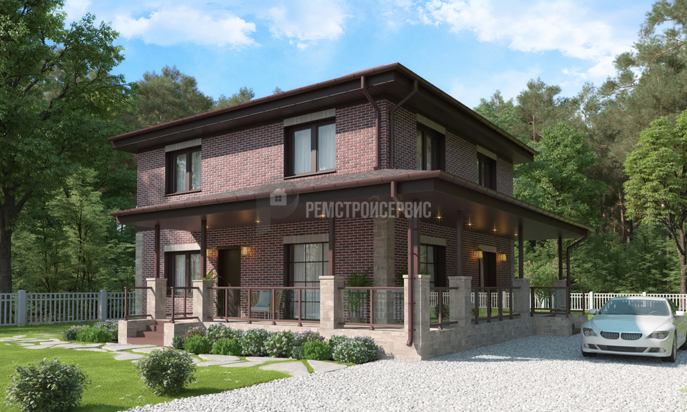 Проект дома в европейском стиле из кирпича. Дом с террасой, панорамные окна. Ремстройсервис Т-63-01