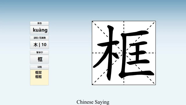框 (kuàng) frame (e.g. for door); casing; template; fig. framework; to circle (i.e. draw a circle aro