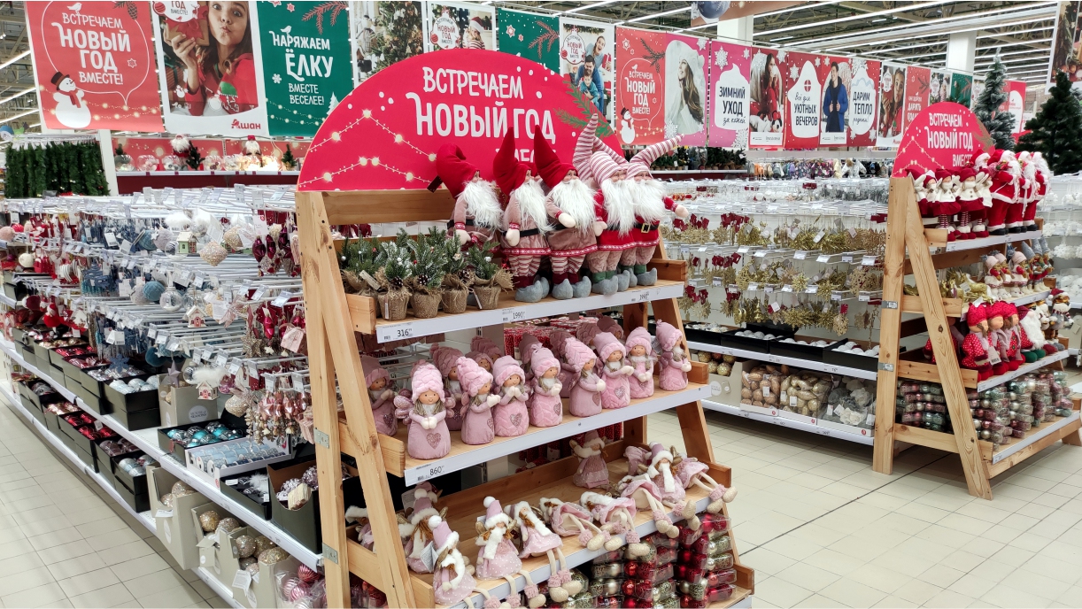 Обзор полочек в магазине Ашан, новогодние украшения, декор, одежда.