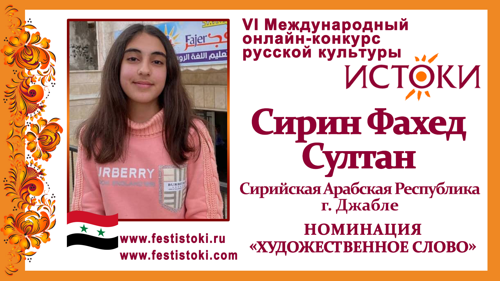 Сирин Фахед Султан, 11 лет. Сирия, г. Джабле. "Песня о соколе" (часть вторая)
