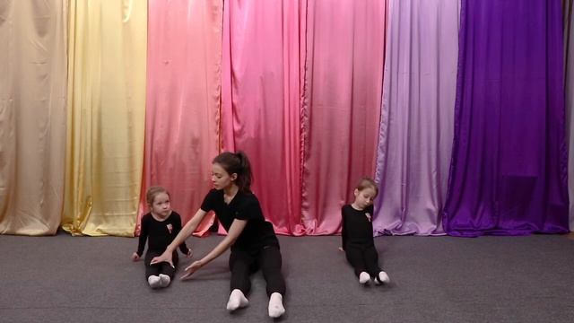 Исходное положение на полу, вытягиваем ножки вперед, стопы натянуты, пятки вместе, носочки врозь, спина прямая, руки стоят рядом с туловищем. Начинаем втягивать колени так, чтобы пятки оторвались от пола. Оторвали пяточки от пола и держим. Ножки от пола не отрываем!!! Только пяточки.