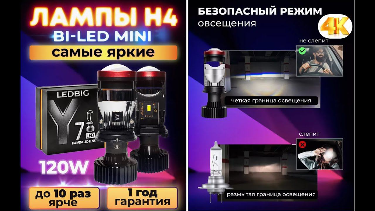 АВТОМОБИЛЬНЫЕ ЛАМПЫ C ОХЛАЖДЕНИЕМ 12000 ОБ/МИН LEDBIG H4-Y7D-LINZA-120W