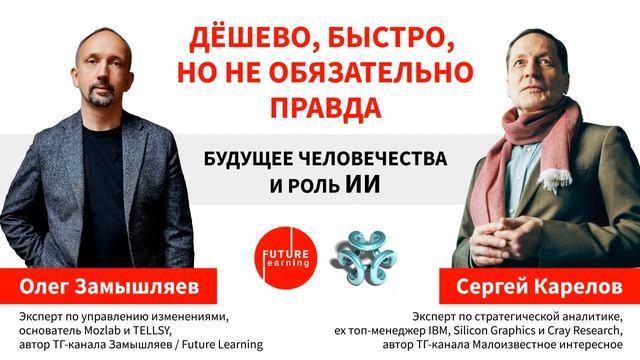 Разговор о том, обладает ли ИИ интеллектом — вопрос прошлого. Мы уже принимаем множество решений совместно с ИИ и не можем отделить свою волю от его: когда выбираем кроссовки, фильм или партнёра, выдаём ссуду или страховку. Олег Замышляев, основатель консалтинговой компании Mozlab и сервиса TELLSY, автор телеграм-канала Замышляев / Future Learning (https://t.me/futurelearning) и Сергей Карелов, эксперт по стратегической аналитике, ex топ-менеджер IBM, Silicon Graphics и Cray Research, автора канала Малоизвестное интересное (https://t.me/theworldisnoteasy) встретились, чтобы обсудить: • чего создатели ИИ не знают о его развитии; • как связаны интеллект и воля человека и машины; • как распространится «Эффект Википедии» и сколько будет стоить правда; • кто такие инфорги; • от чего будет зависеть эффективность интеллектуальных гибридов. Приглашаем к прослушиванию! P.S. А первое интевью с Сергеем Кареловым, и по совпадению, наш самый первый подкаст, можно прослушать по ссылке: (https://mozlab.mave.digital/ep-1).