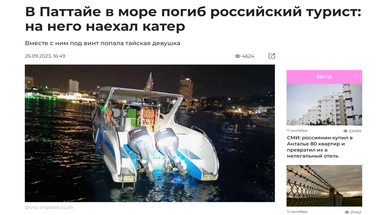 Новости туризма 26/09/2023 В Паттайе в море погиб российский турист: на него наехал катер #туризм
