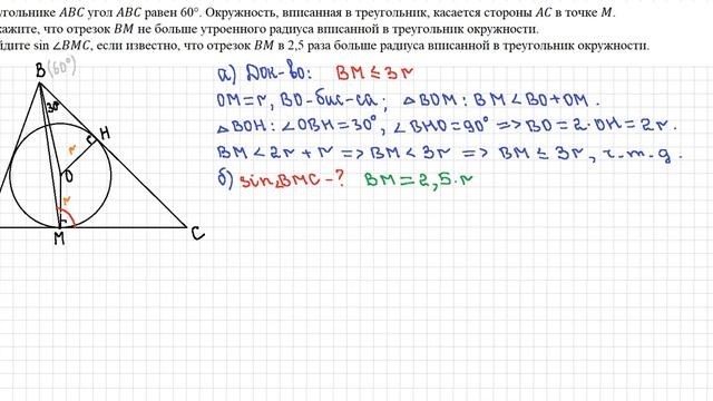 В треугольнике угол равен 60°. Окружность, вписанная в треугольник, касается стороны в точке . а) Докажите, что отрезок не больше утроенного радиуса вписанной в треугольник окружности. б) Найдите sin ∠, если известно, что отрезок в 2,5 раза больше радиуса вписанной в треугольник окружности.