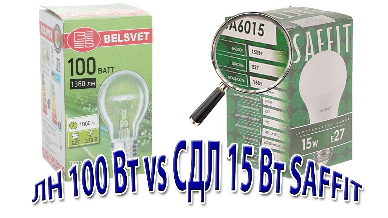 Сравнение светодиодной лампы 15 Вт 2700К SAFFIT с лампой накаливания 100 Вт.