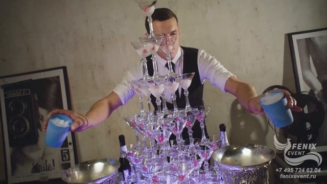Пирамида шампанского на встречу гостей, свадьбу, юбилей и корпоратив - заказать бармен шоу в Москве