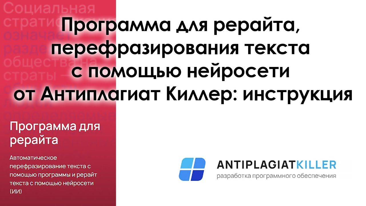 В сегодняшнем видео мы дадим вам полную инструкцию к бесплатной программе от Антиплагиат киллер, которая включает в себя такие системы, как перефразирование текста с помощью искусственного интеллекта, подбор синонимов и повышение уникальности с помощью кодировки. Скачать БЕСПЛАТНУЮ версию можно по ссылке - https://disk.yandex.ru/d/DJgdMz20eybrDA Инструкция пользования в печатном варианте - https://demo705.rp-demo.ru/support/rukovodstvo-polzovatelya Наш сайт - https://killer-antiplagiat.ru/ ПРОМОКОД НА СКИДКУ 20% - AKyou Почта - support@antiplagiat-killer.ru Группа ВКонтакте - https://vk.com/kakobmanut_antiplagiat НАШИ УСЛУГИ: Проверить уникальность текста, в том числе через Антиплагиат.ВУЗ - https://killer-antiplagiat.ru/proverit-unikalnost-teksta-onlajn Повысить уникальность текста - https://killer-antiplagiat.ru/povysit-unikalnost-teksta-onlajn Заказать ручной рерайт текста - https://killer-antiplagiat.ru/ruchnoj-rerajt-teksta-zakazat Оформление научной работы по ГОСТу - https://killer-antiplagiat.ru/oformit-rabotu-po-gostu-onlajn-besplatno НАШИ БЕСПЛАТНЫЕ УСЛУГИ: Бесплатное повышение уникальности текста - https://killer-antiplagiat.ru/povysit-unikalnost-teksta-onlajn-besplatno Синонимайзер текста - https://killer-antiplagiat.ru/synonimizer Переписать текст с помощью искусственного интеллекта - https://killer-antiplagiat.ru/perepisat-perefrazirovat-tekst-nejrosetyu-ai-iskustvennyj-intellekt-besplatno-onlajn Текстовая статья о том, как повысить уникальность текста - https://killer-antiplagiat.ru/blog/kak-povysit-originalnost-teksta Текстовая статья о том, как проверить текст на уникальность бесплатно - https://killer-antiplagiat.ru/blog/antiplagiat-besplatno