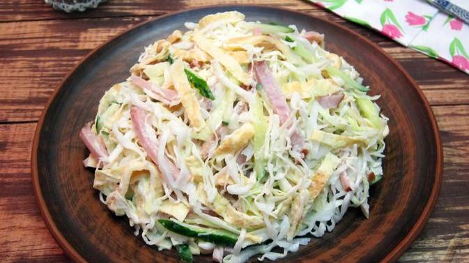 Салат с ветчиной, капустой, огурцами и яичными блинчиками получается сочным, хрустящим и сытным. Свежие овощи прекрасно сочетаются с ветчиной и дополняются яичными блинчиками. Простой и сытный салат для праздничного стола или ужина. #СалатСВетчиной #СалатСКапустой #СалатЯйцами #СалатСОгурцами