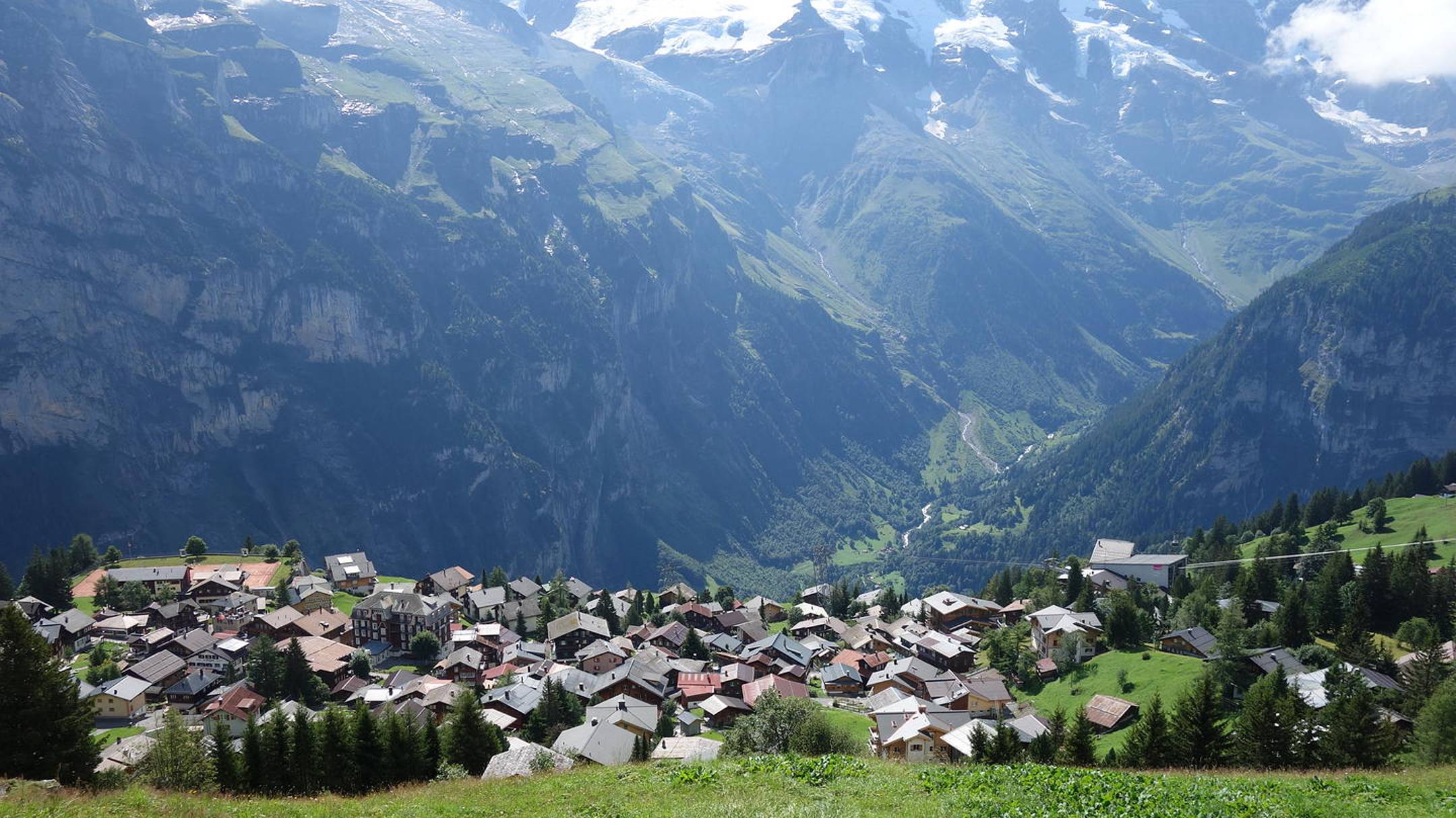 Посёлок расположен на скале, на запад от Лаутербруннена. Исходник: "Discovering Murren A Swiss Village Walking Tour in Enchanting Switzerland - Relaxing 4k video" mp4.