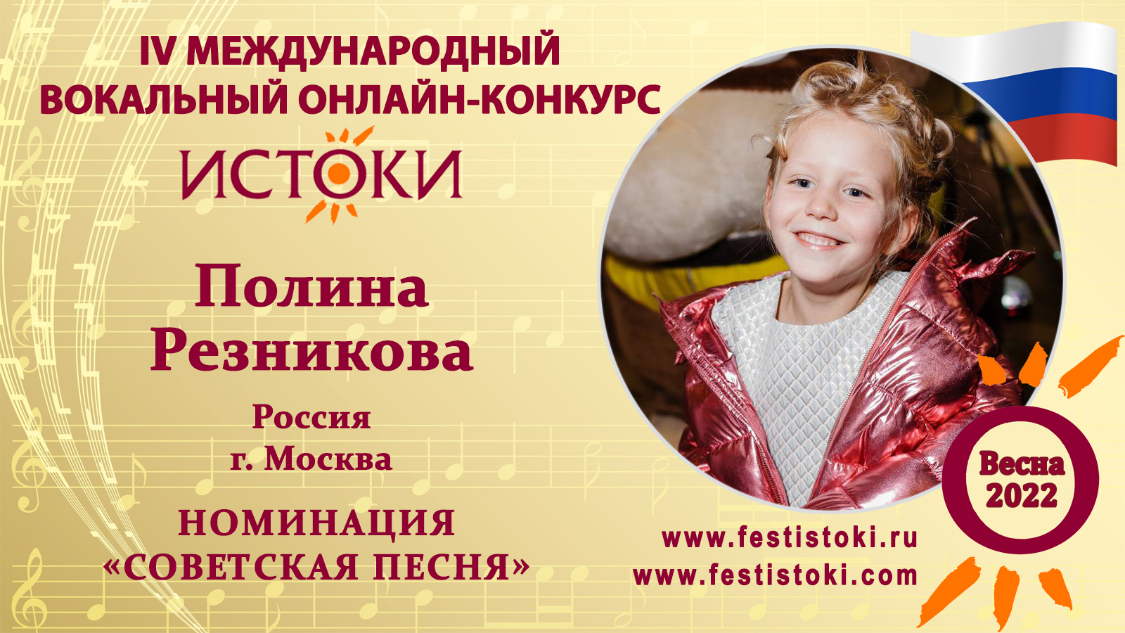 Лауреат III степени IV Международного вокального онлайн-конкурса «Истоки».Весна-2022. Номинация "Советская песня". Песня песня "Черный кот". Музыка Юрия Саульского, стихи Михаила Танича. Сайт: www.festistoki.ru / www.festistoki.com E-mail: festistoki@mail.ru