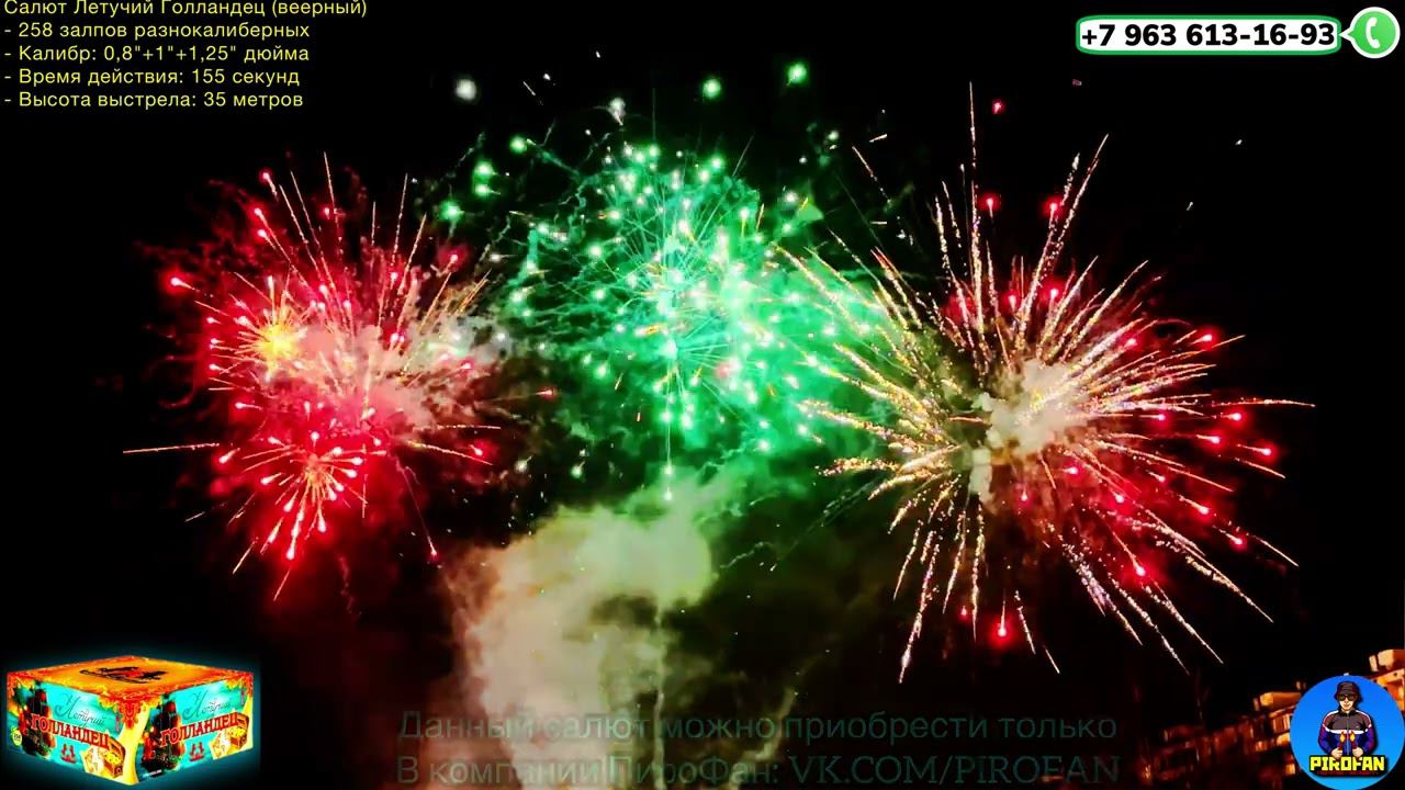 https://vk.com/PiroFan - СКИДКИ ДО 50% в нашем официальном магазине FFW2033-200 Салют Летучий Голландец (веерный) - 258 залпов разнокалиберных - Калибр: 0,8"+1"+1,25" дюйма - Время действия: 155 секунд - Высота выстрела: 35 метров - Есть сертификат и гарантия от ПироФан