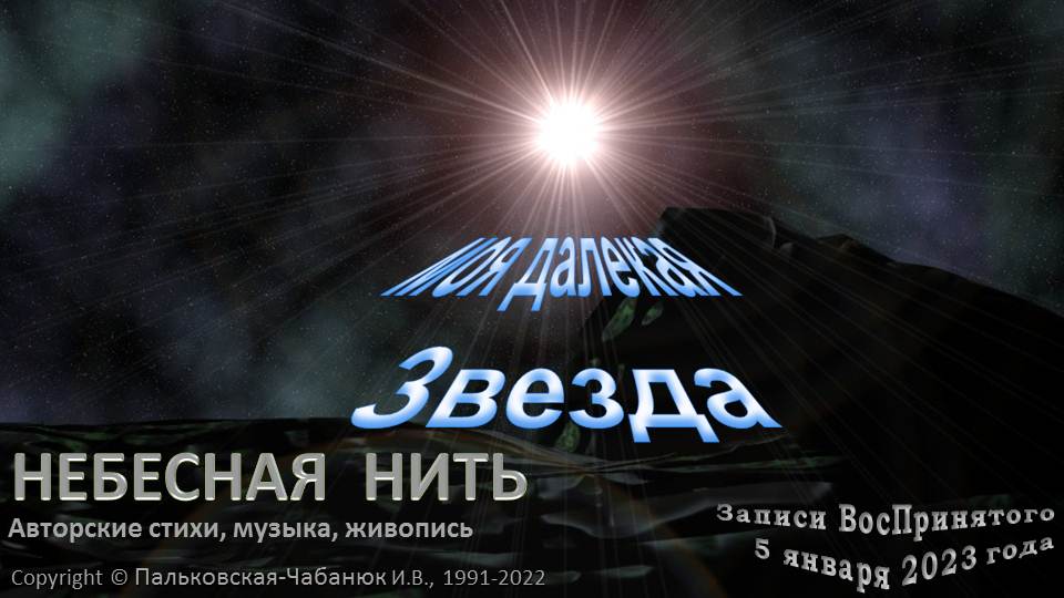 из ДНЕВНИКА - ЗАПИСИ ВосПринятого-Небесная Нить-5 января 2023 г.-Авторские стихи, музыка, живопись- музыкально-поэтическая композиция "МОЯ ДАЛЕКАЯ ЗВЕЗДА" Авторская музыка Небесной Нити (1992 г), художественное декламирование и создание композиции (видео ролик 6 января 2023 г.)