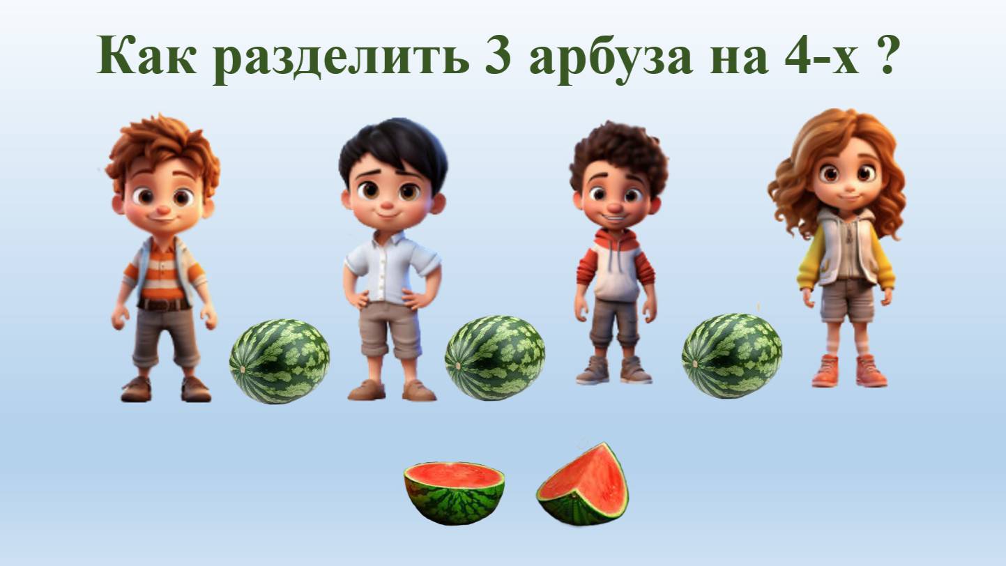 Как разделить 3 арбуза на 4-х ? Математика. Алгебра. Геометрия. Для учителя, ученика https://t.me/RUTUBEMATEMATIK