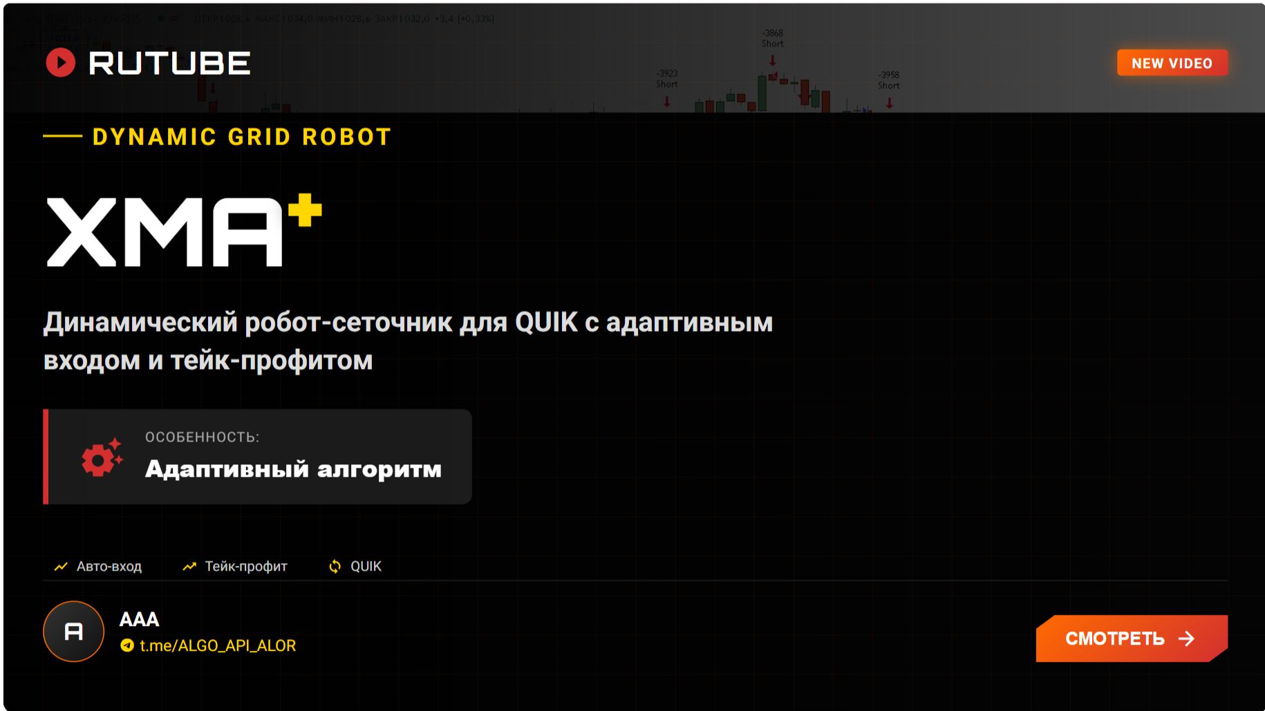 XMA+: Динамический робот-сеточник для QUIK с адаптивным входом и тейк-профитом 📝 Описание: В этом видео представлен алгоритмический торговый робот XMA+ — динамический сеточник для терминала QUIK с интеллектуальной адаптацией под рыночные условия. Бот автоматически корректирует шаг входа в позицию и размер тейк-профита в зависимости от текущей волатильности, что позволяет эффективно работать на разных фазах рынка. 🔹 Ключевые особенности XMA+: 🎯 Адаптивный шаг входа в позицию — подстраивается под силу и направление тренда; 📊 Динамический тейк-профит — рассчитывается на основе текущей волатильности; ⚙️ Полная автоматизация — работает 24/7 без постоянного контроля; 🔐 Совместимость с QUIK — популярная платформа для трейдинга на российском рынке; 📈 Гибкая настройка под любые инструменты: акции, фьючерсы, валютные пары. 🔹 Что вы узнаете из видео: Принцип работы динамической сетки в роботе XMA+; Как адаптируются параметры входа и выхода из сделок; Настройка бота под разные торговые инструменты; Примеры работы стратегии в реальных рыночных условиях. 💡 Для кого это видео: Трейдеры, алготрейдеры, пользователи QUIK и все, кто интересуется автоматизацией торговли, сеточными стратегиями и адаптивными алгоритмами. 🔗 Полезные ссылки: • Официальный телеграм-канал: https://t.me/ALGO_API_ALOR • Поддержка и документация: https://t.me/ALGO_API_ALOR • [Добавьте другие ссылки при необходимости] ⚠️ Дисклеймер: Видео носит исключительно информационный и образовательный характер. Не является индивидуальной инвестиционной рекомендацией. Торговля на финансовых рынках сопряжена с риском потери капитала. Проводите собственное исследование и консультируйтесь с профессионалами перед началом торговли. #алготрейдинг #сеточнаястратегия #торговыйробот #XMAplus #QUIK #автоматизацияторговли #адаптивныйалгоритм #волатильность #тейкпрофит #криптотрейдинг #биржа #трейдинг #алгоритмическаяторговля #сеткаордеров #финансовыерынки #ALGOAPIALOR #алготрейдинг #сеточнаястратегия #торговыйробот #XMAplus #QUIK #автоматизацияторговли #адаптивныйалгоритм #волатильность #тейкпрофит #криптотрейдинг #биржа #трейдинг #алгоритмическаяторговля #сеткаордеров #финансовыерынки #ALGOAPIALOR