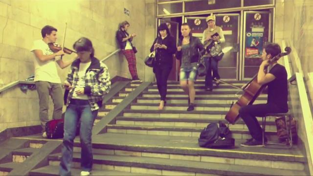 Street artists perorm a cover of Evlis Presley song 'It's now or never'' near a subway station in Kyiv, Ukraine
