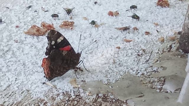 Сыпанул муравьишкам угощеньица, так со временем и мухи и осы и шершни налетели и чифанят, а теперь еще и бабочка пристоловалась :))